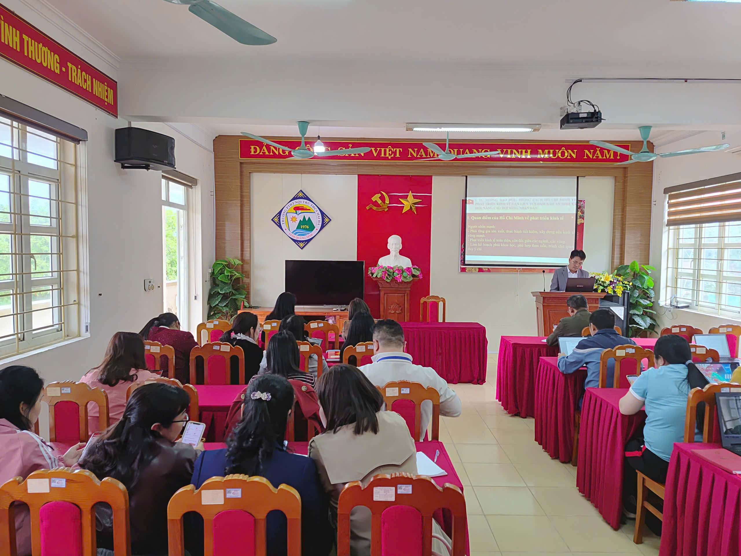 Buổi sinh hoạt diễn ra trong không khí nghiêm túc, dân chủ, trách nhiệm. Các đồng chí đảng viên đã cùng nhau quán triệt sâu sắc quan điểm của Bác về phát triển kinh tế phải đi đôi với chăm lo đời sống Nhân dân; tăng trưởng phải gắn với tiến bộ và công bằng xã hội. Từ đó, liên hệ sát với nhiệm vụ của nhà trường – một đơn vị giáo dục vùng dân tộc thiểu số, nơi việc bảo đảm điều kiện học tập, sinh hoạt và nâng cao chất lượng giáo dục chính là góp phần thiết thực vào công tác an sinh xã hội tại địa phương.