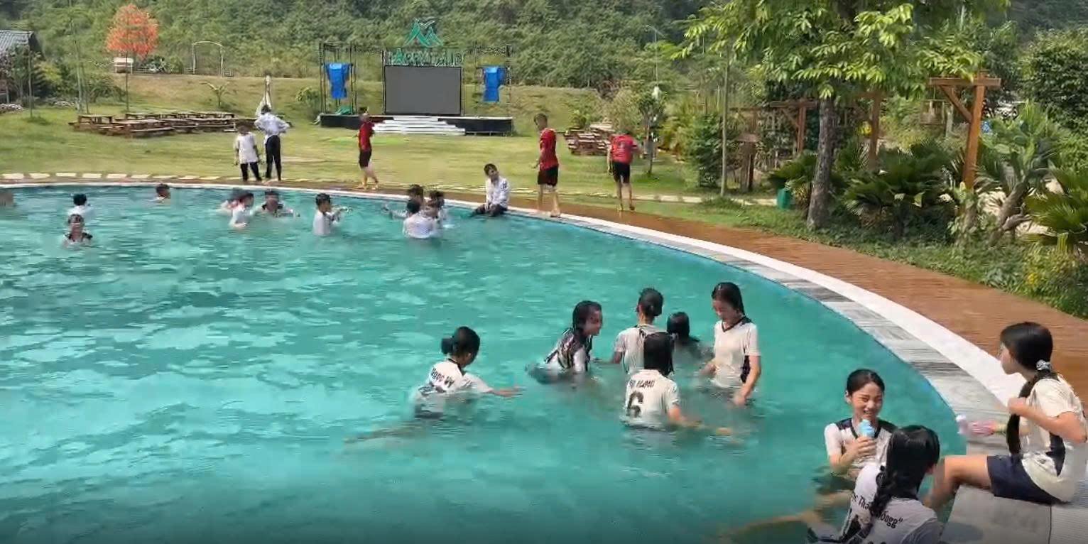 Buổi chiều tại Happy Land là khoảng thời gian vui chơi, trải nghiệm sôi động với các hoạt động như trượt khô, bắn cung, bơi lội… mang lại tiếng cười và sự gắn kết giữa các em học sinh.