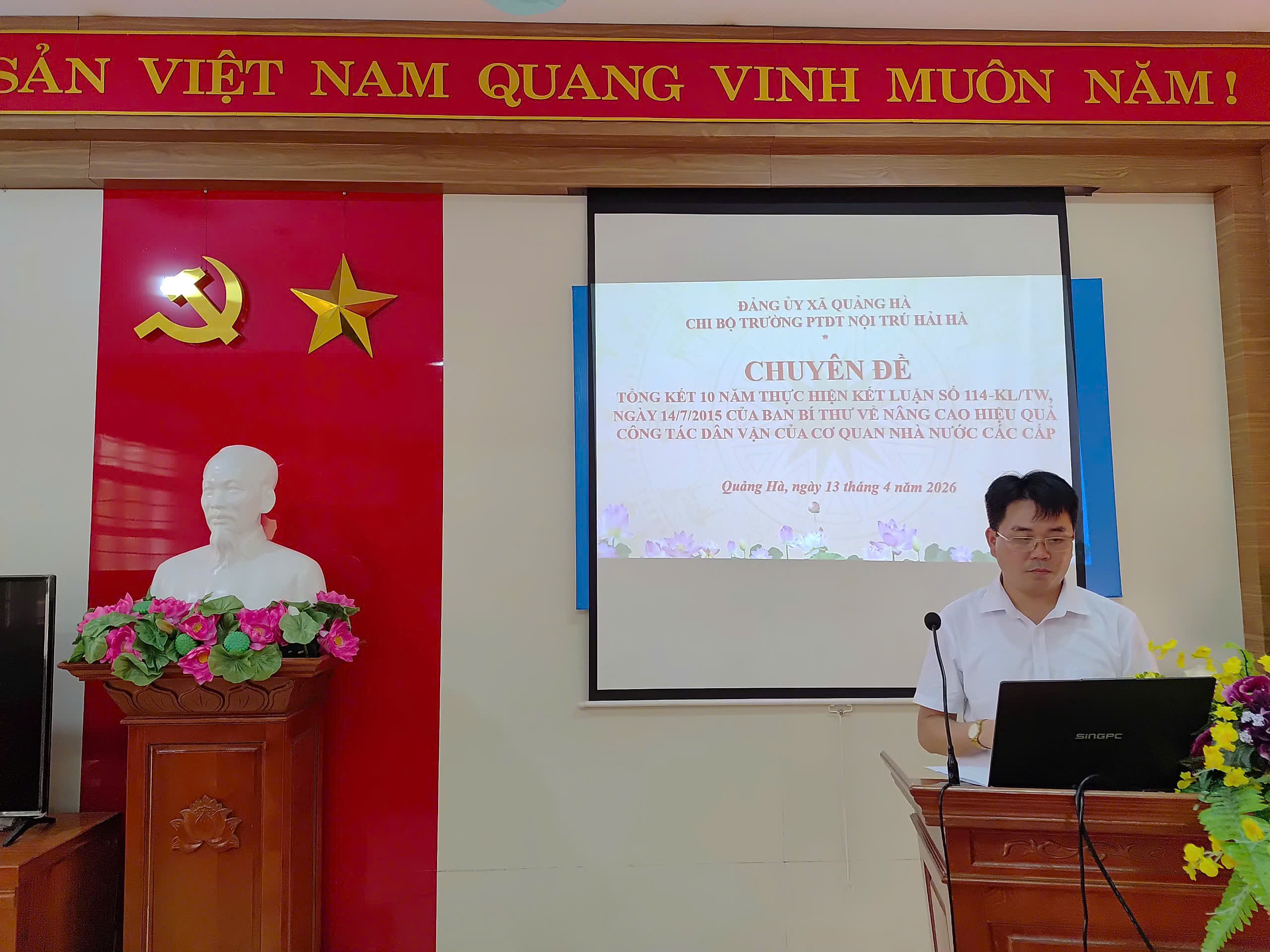 Thực hiện Kế hoạch số 49-KH/TU ngày 03/4/2026 của Ban Thường vụ Tỉnh ủy về tổng kết 10 năm thực hiện Kết luận số 114-KL/TW ngày 14/7/2015 của Ban Bí thư về nâng cao hiệu quả công tác dân vận của cơ quan nhà nước các cấp, Chi bộ Trường PTDT Nội trú THCS Hải Hà đã tổ chức sinh hoạt chuyên đề với nội dung: