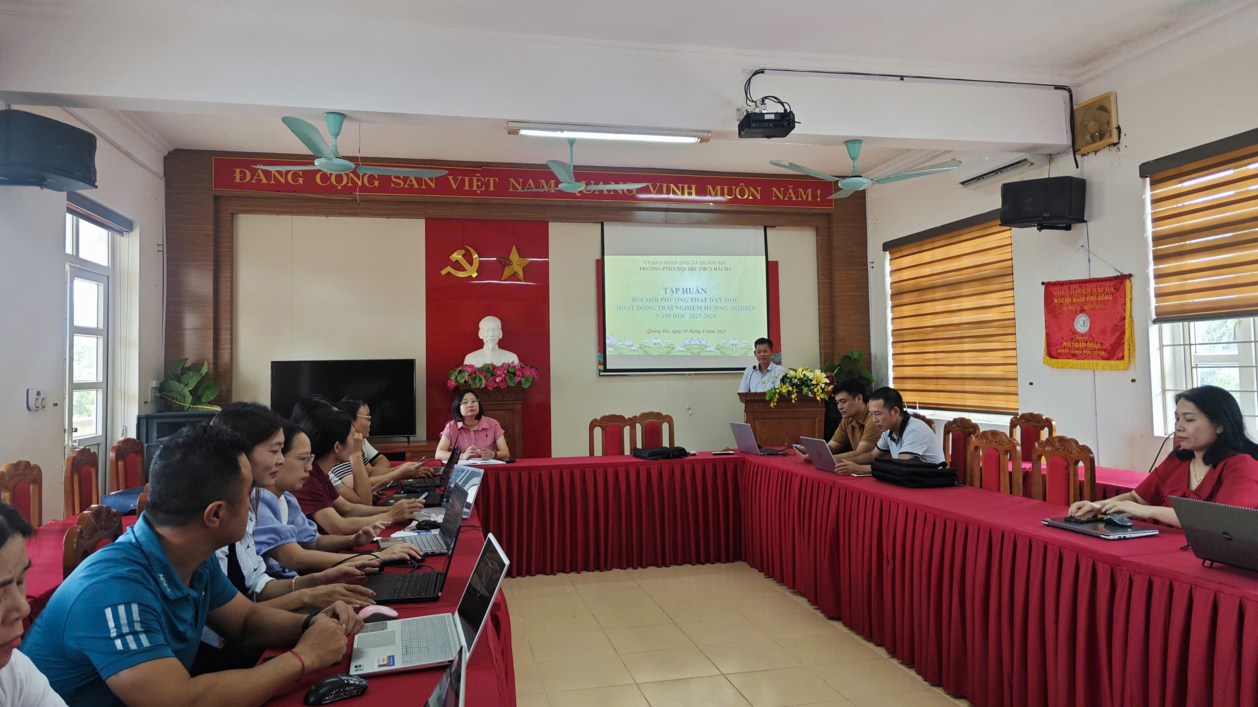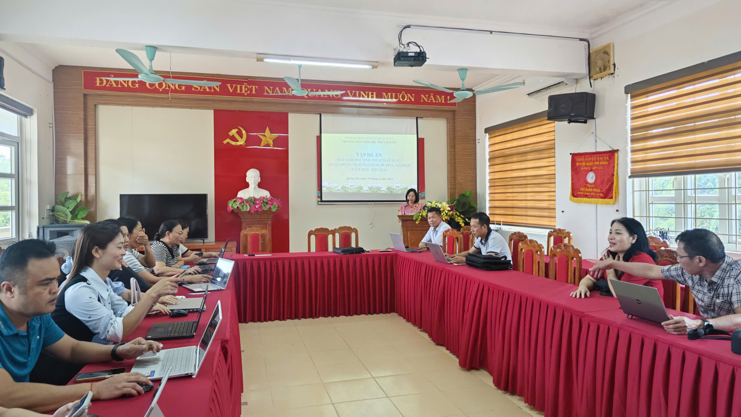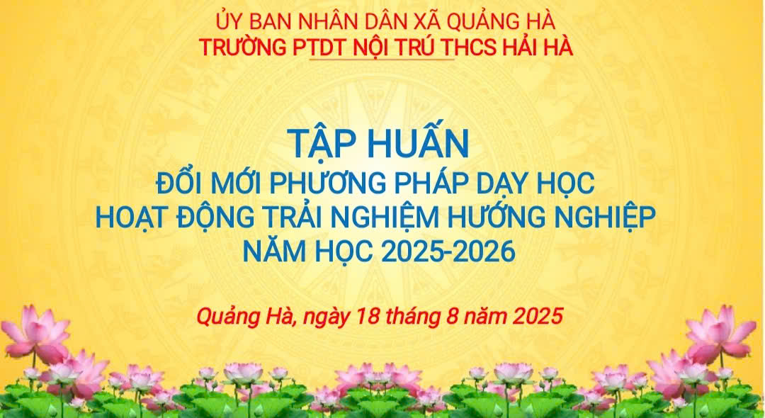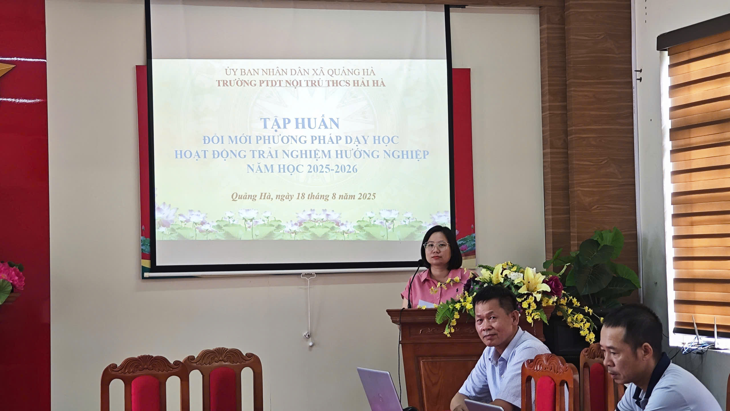 Thưc hiện sự chỉ đạo của Sở giáo dục và Đào tạo về nhiệm vụ bồi dưỡng chuyên môn góp phần nâng cao chất lượng giảng dạy trong nhà trường, ngày 18/8/2025 trường PTDT nội trú THCS Hải Hà đã tổ chức tập huấn cho đội ngũ giáo viên dạy Hoạt động trải nghiệm hướng nghiệp, giáo viên làm công tác chủ nhiệm lớp, cán bộ và giáo viên phụ trách tư vấn tâm lý học đường.