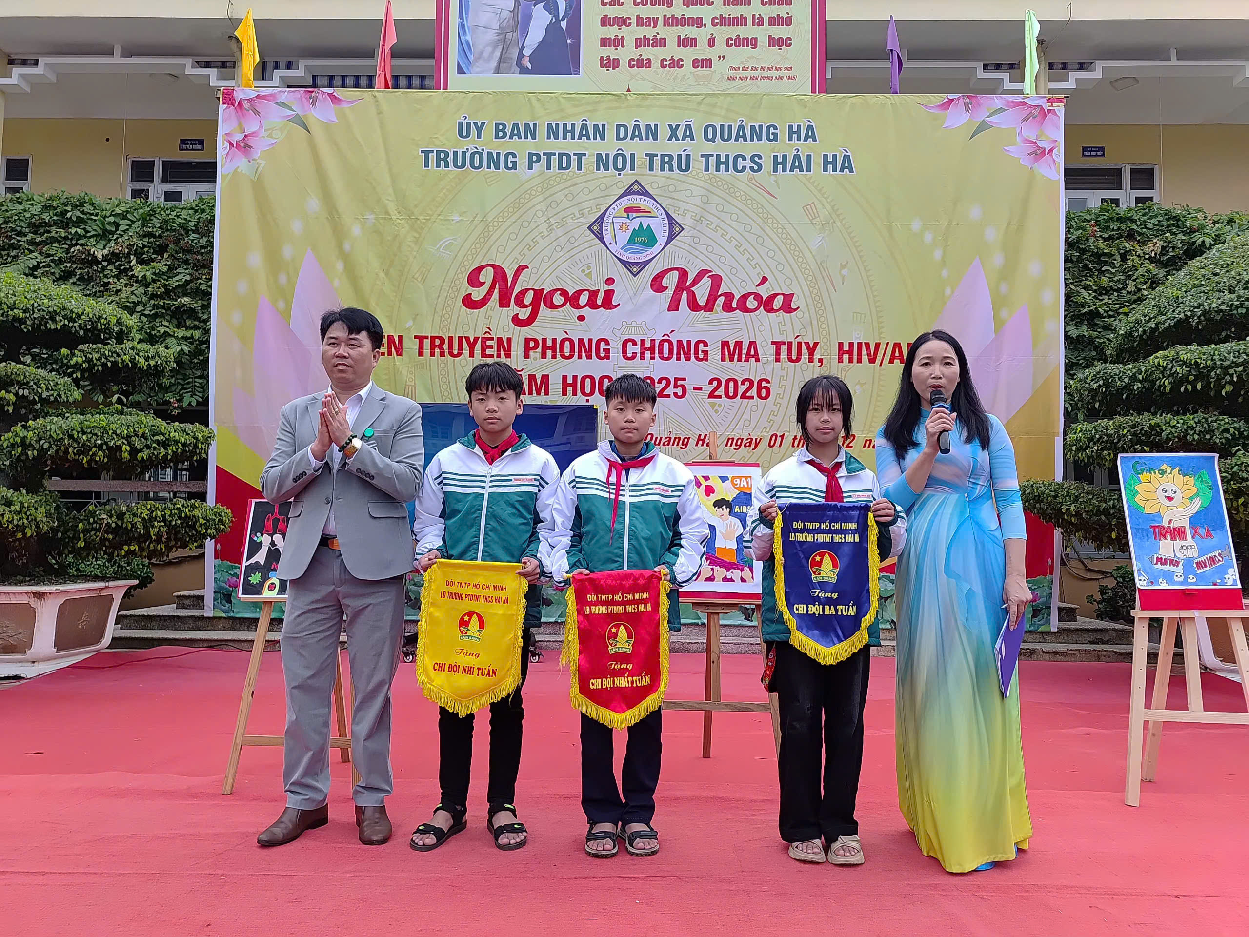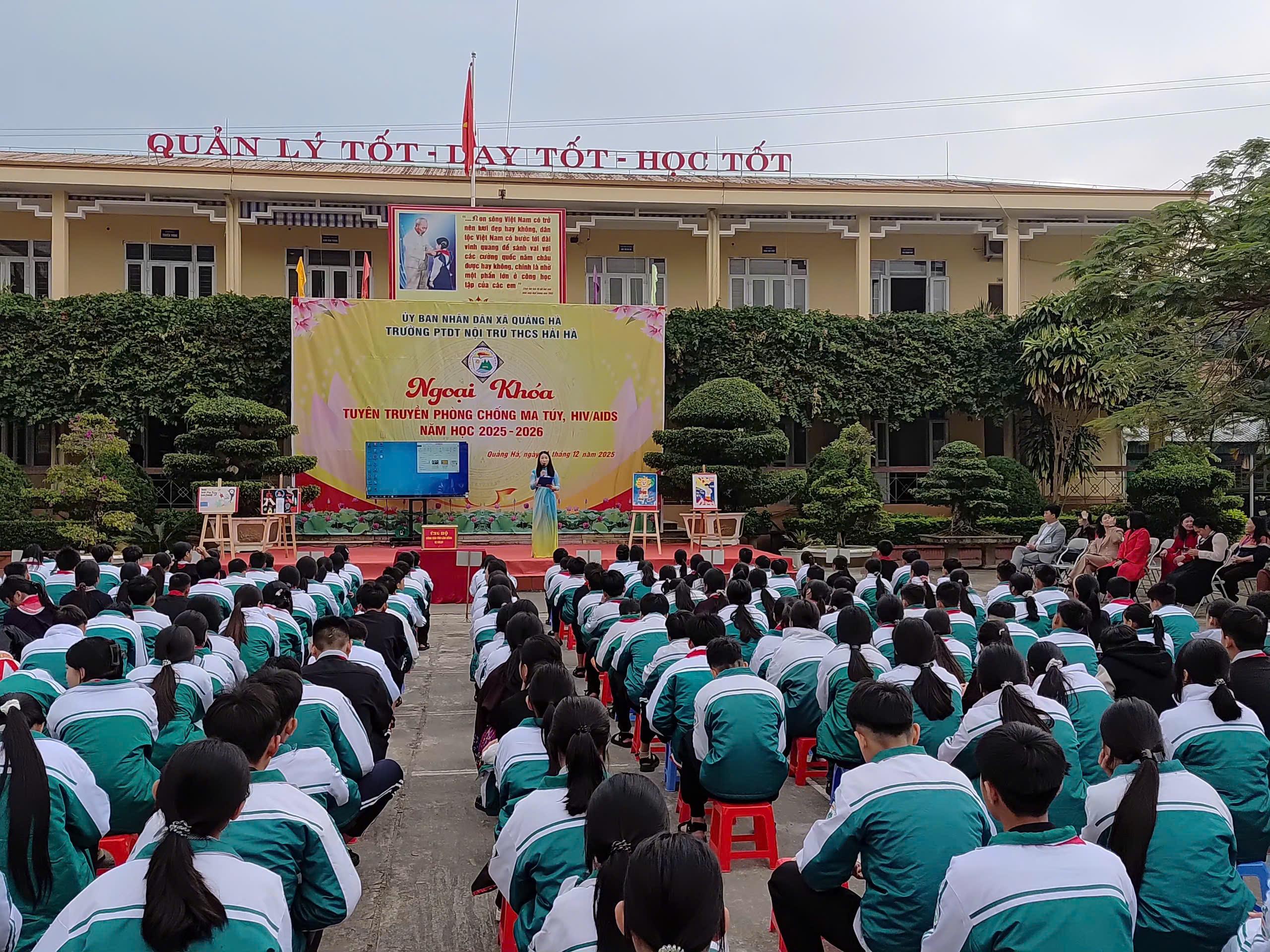 Hưởng ứng Tháng hành động quốc gia phòng, chống HIV/AIDS năm 2025 và Ngày Thế giới phòng, chống AIDS 01/12, sáng ngày 01/12/2025, Liên đội Trường PTDTNT THCS Hải Hà đã tổ chức hoạt động ngoại khóa tuyên truyền phòng chống ma túy, HIV/AIDS với sự tham gia đầy đủ của cán bộ, giáo viên, nhân viên và toàn thể học sinh nhà trường.