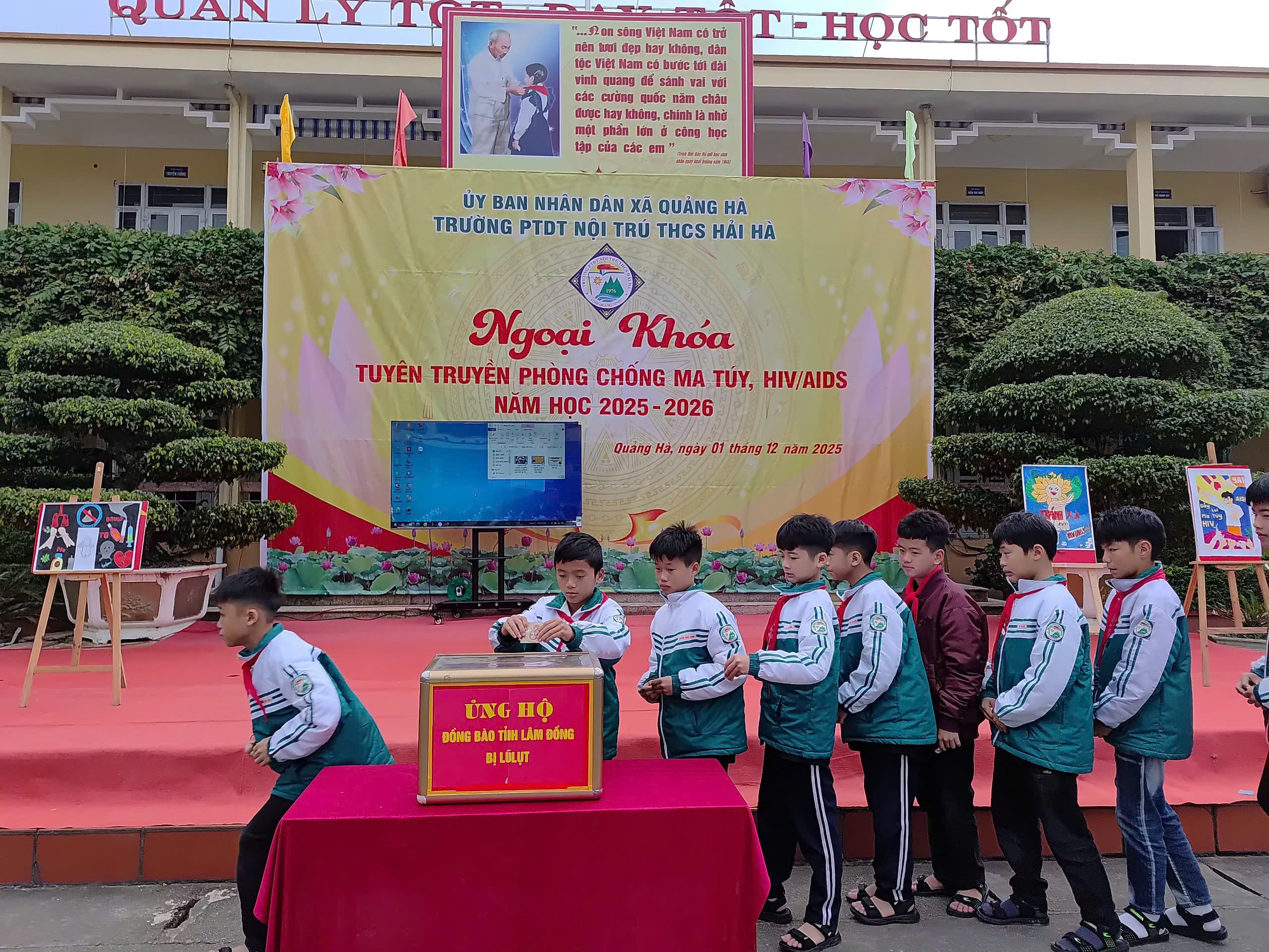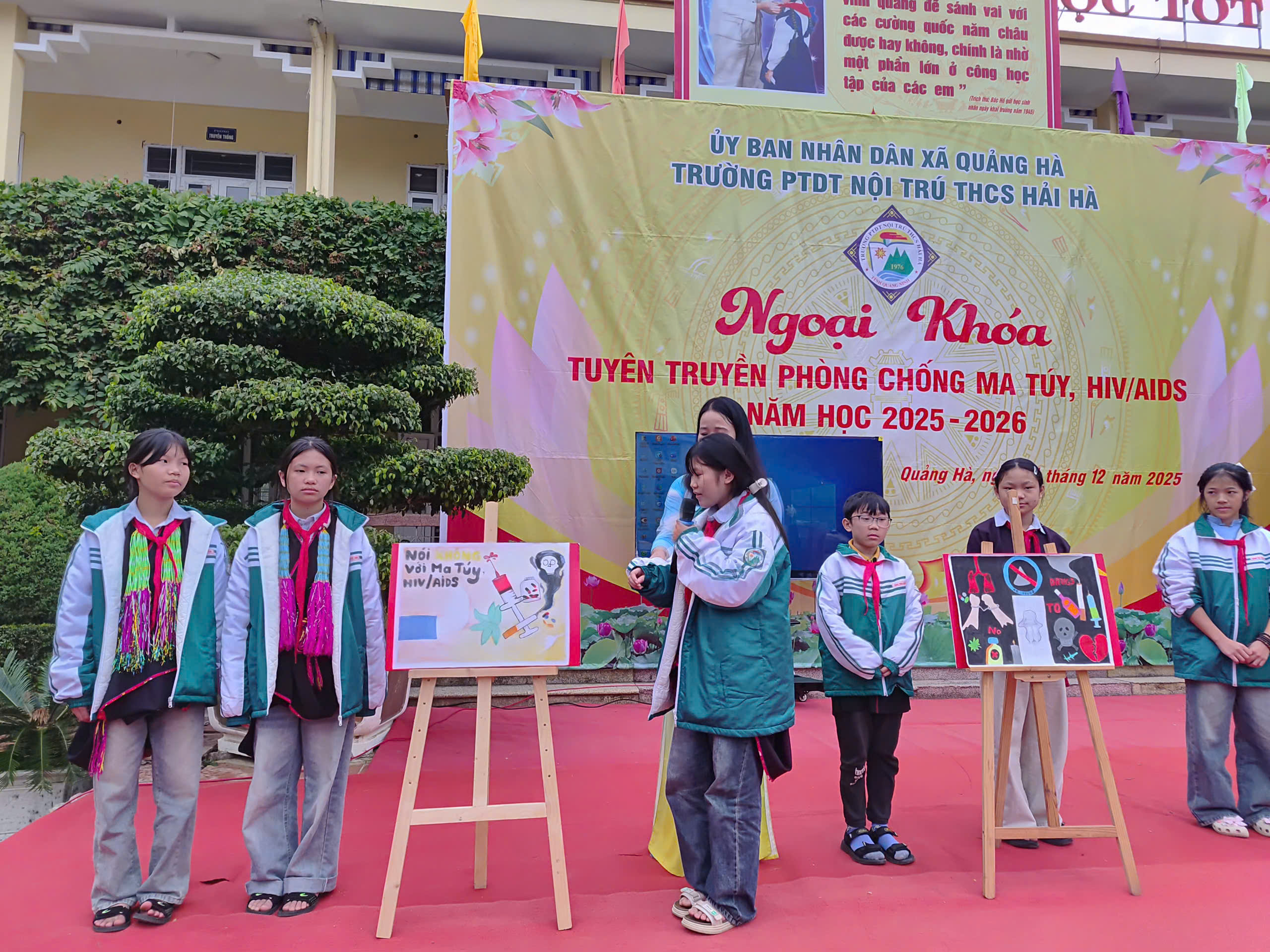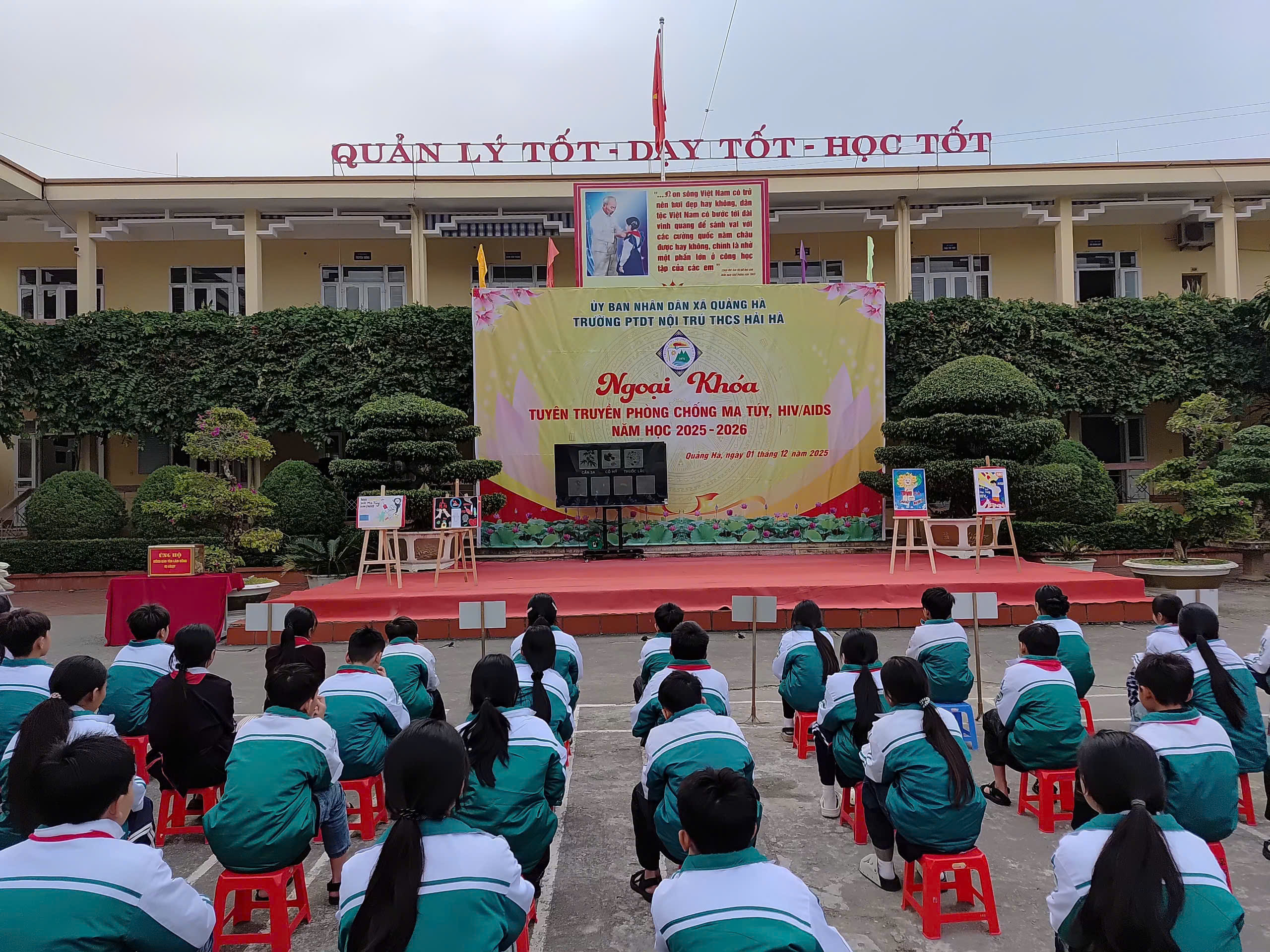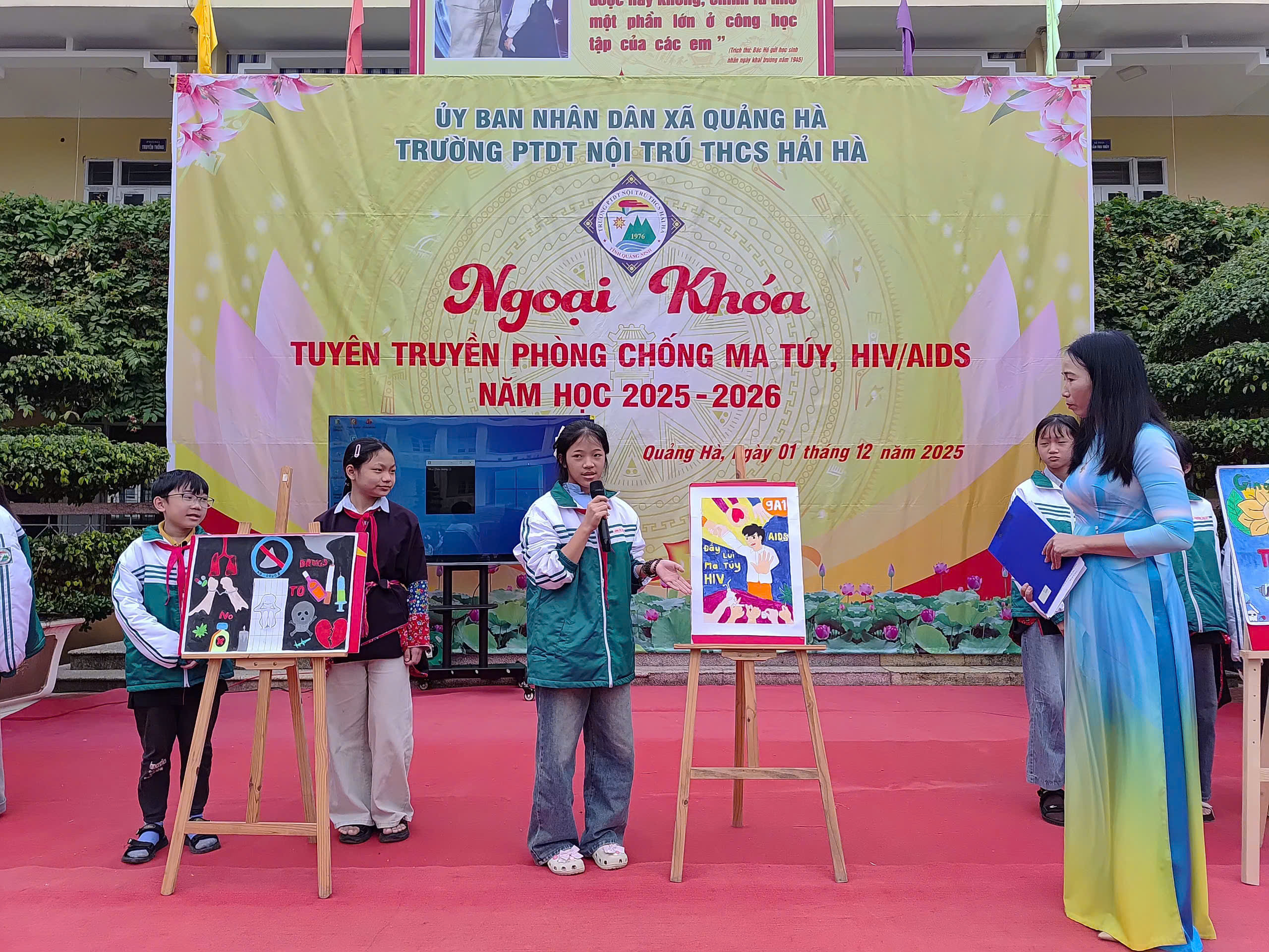 Hưởng ứng Tháng hành động quốc gia phòng, chống HIV/AIDS năm 2025 và Ngày Thế giới phòng, chống AIDS 01/12, sáng ngày 01/12/2025, Liên đội Trường PTDTNT THCS Hải Hà đã tổ chức hoạt động ngoại khóa tuyên truyền phòng chống ma túy, HIV/AIDS với sự tham gia đầy đủ của cán bộ, giáo viên, nhân viên và toàn thể học sinh nhà trường.