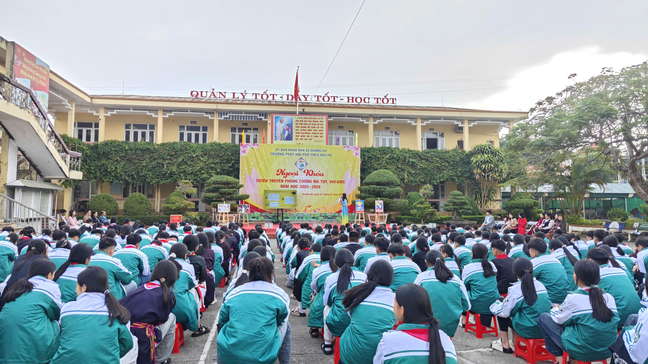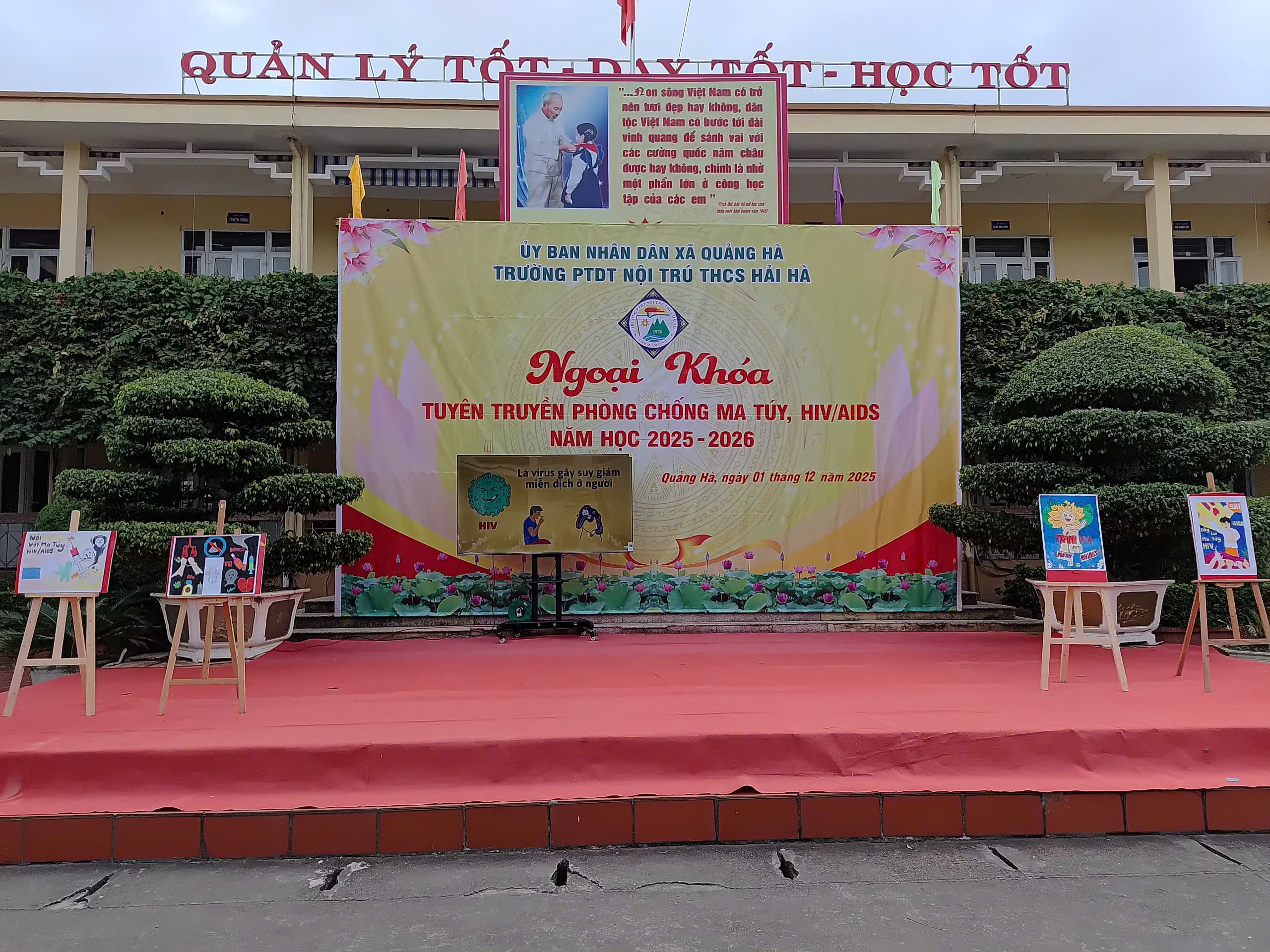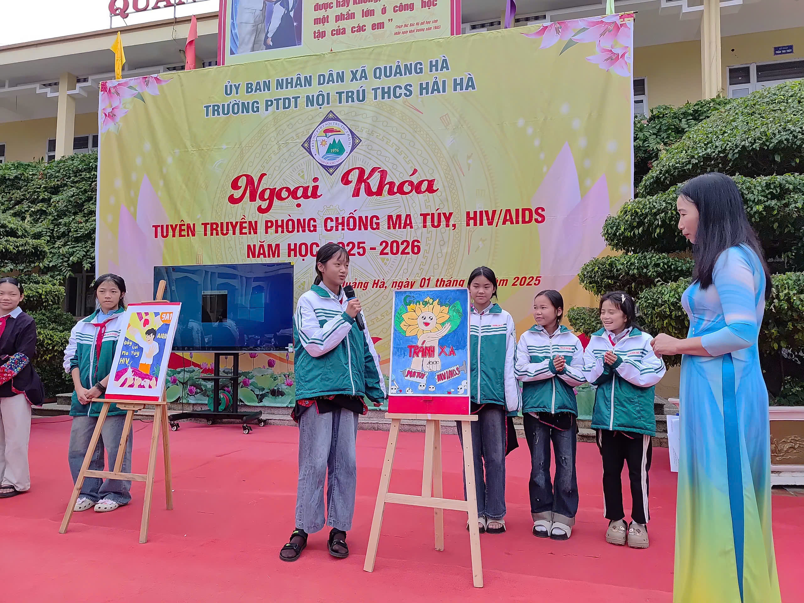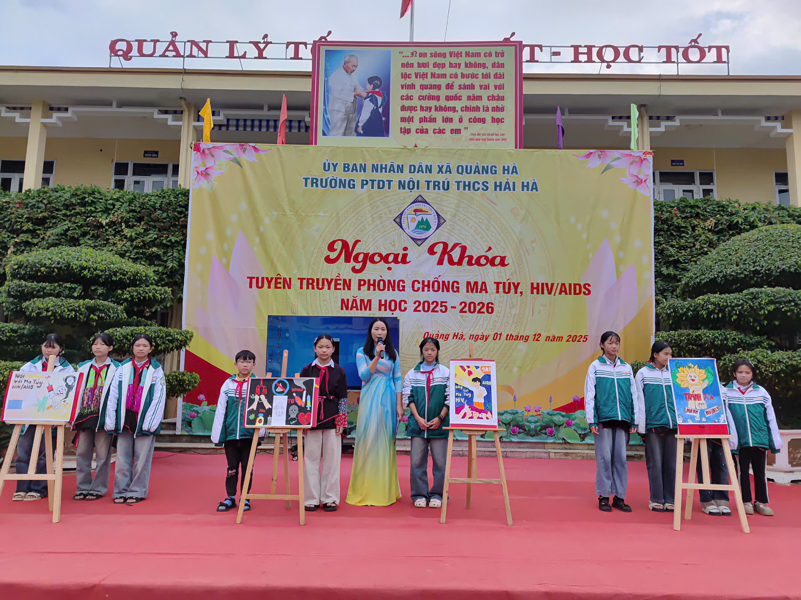 Hưởng ứng Tháng hành động quốc gia phòng, chống HIV/AIDS năm 2025 và Ngày Thế giới phòng, chống AIDS 01/12, sáng ngày 01/12/2025, Liên đội Trường PTDTNT THCS Hải Hà đã tổ chức hoạt động ngoại khóa tuyên truyền phòng chống ma túy, HIV/AIDS với sự tham gia đầy đủ của cán bộ, giáo viên, nhân viên và toàn thể học sinh nhà trường.