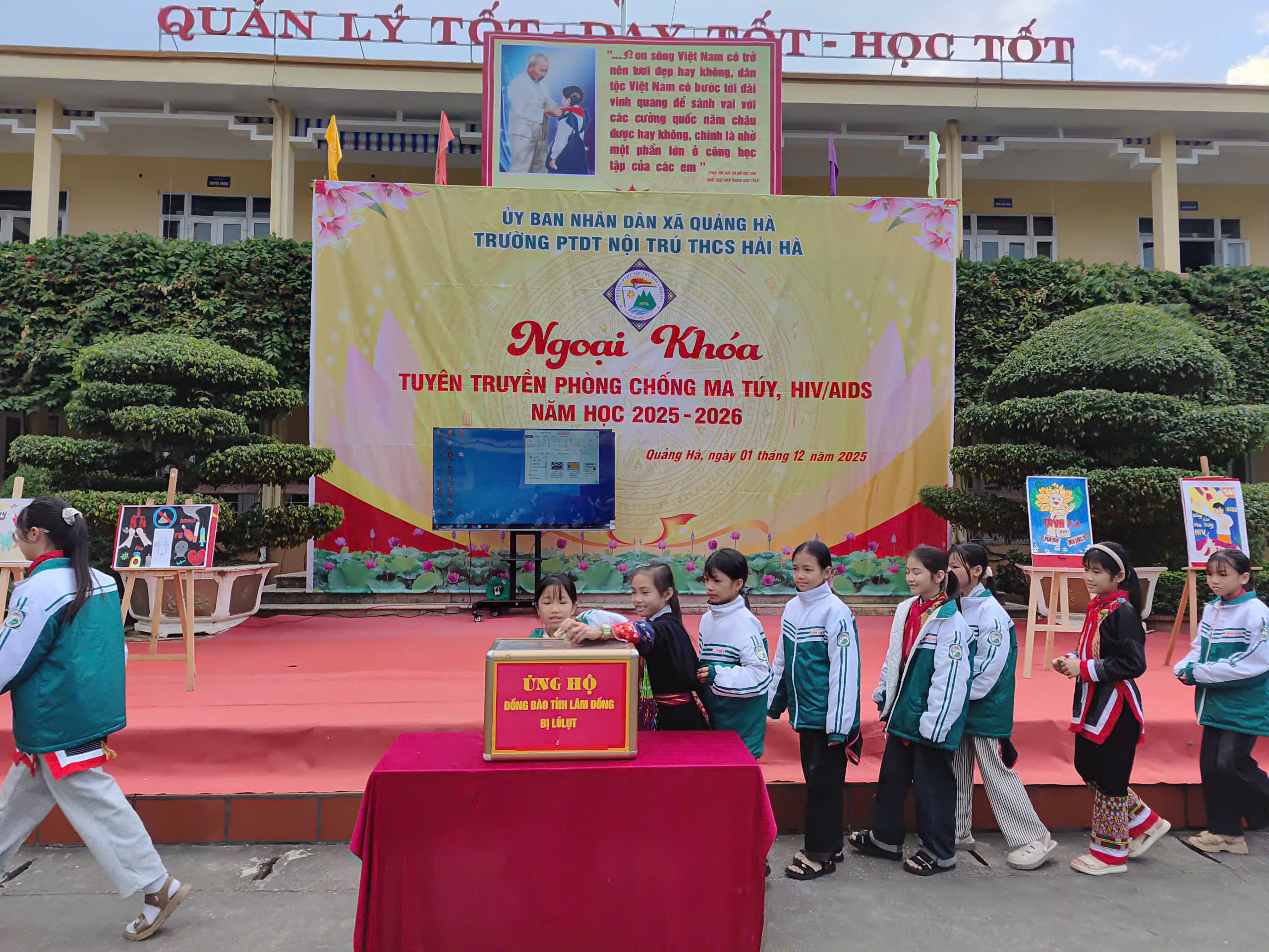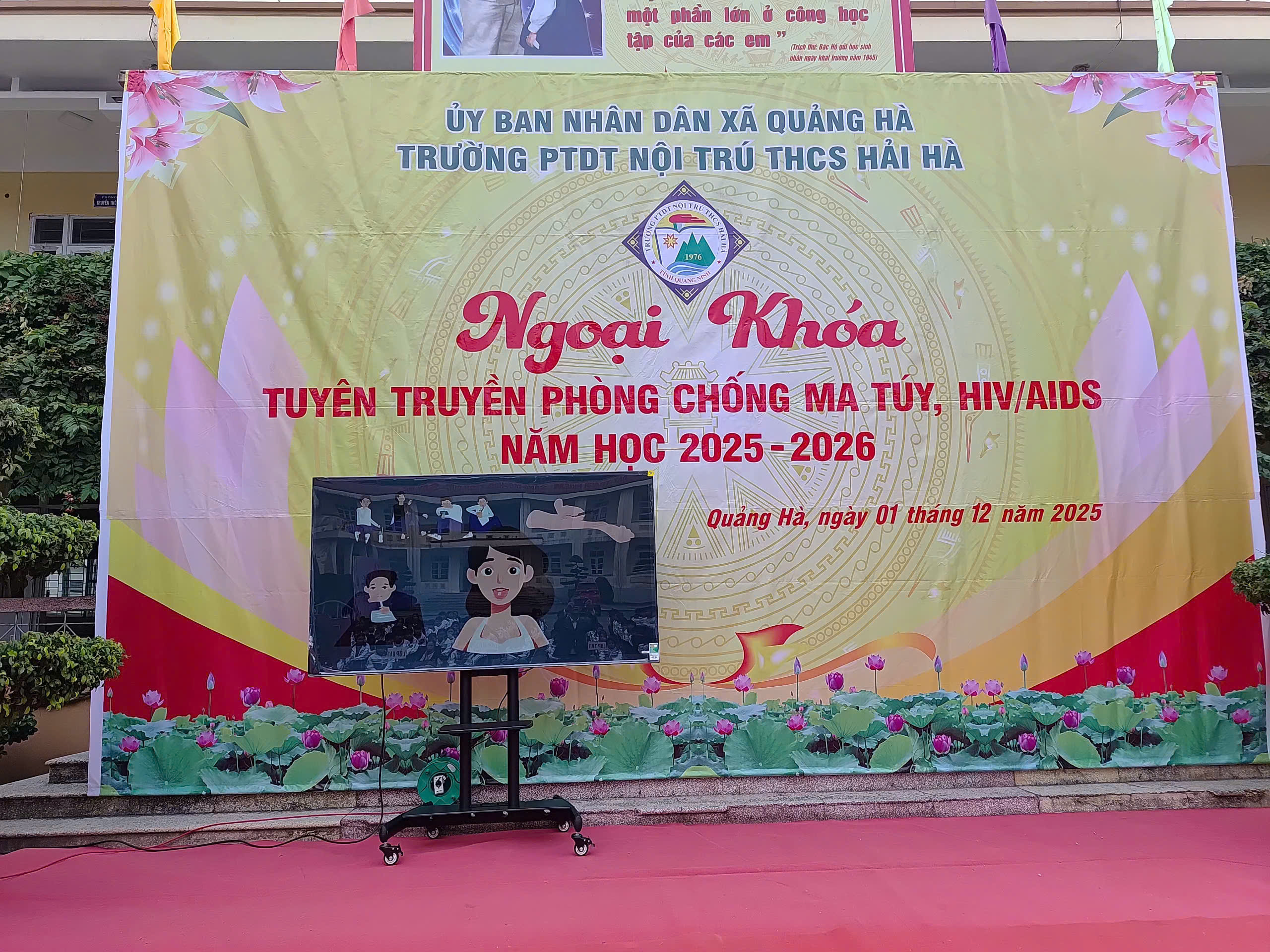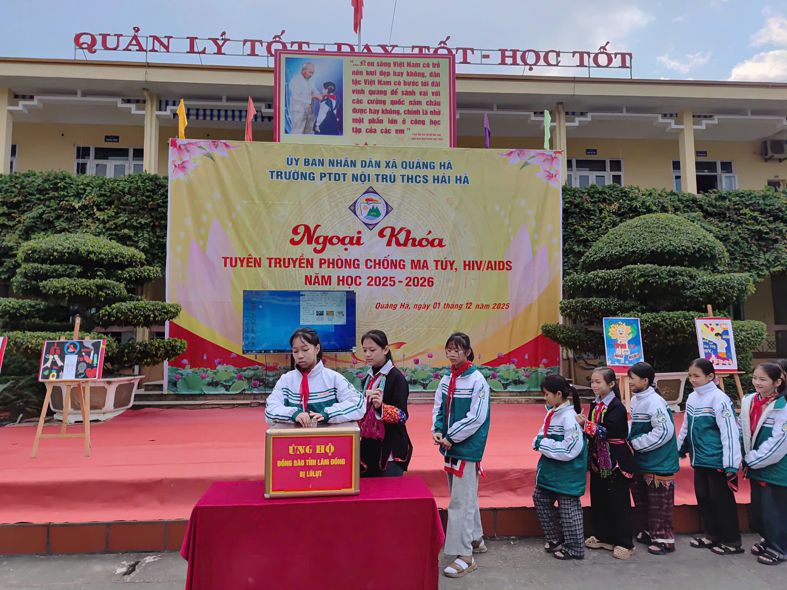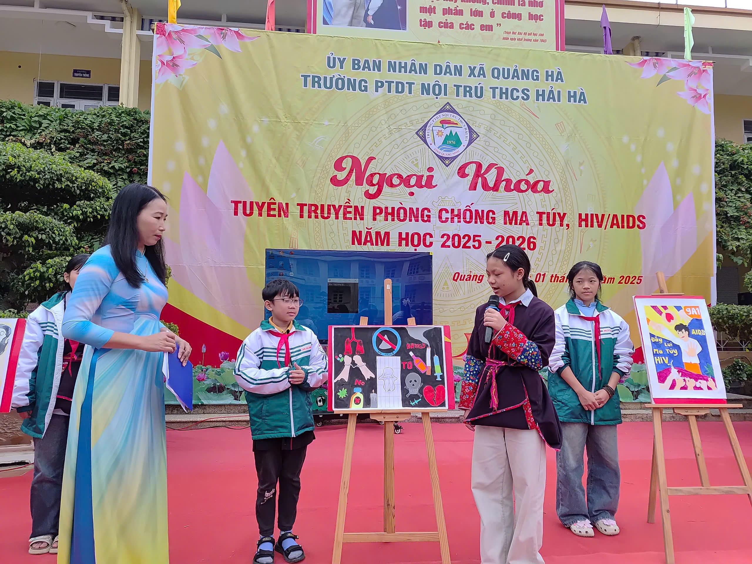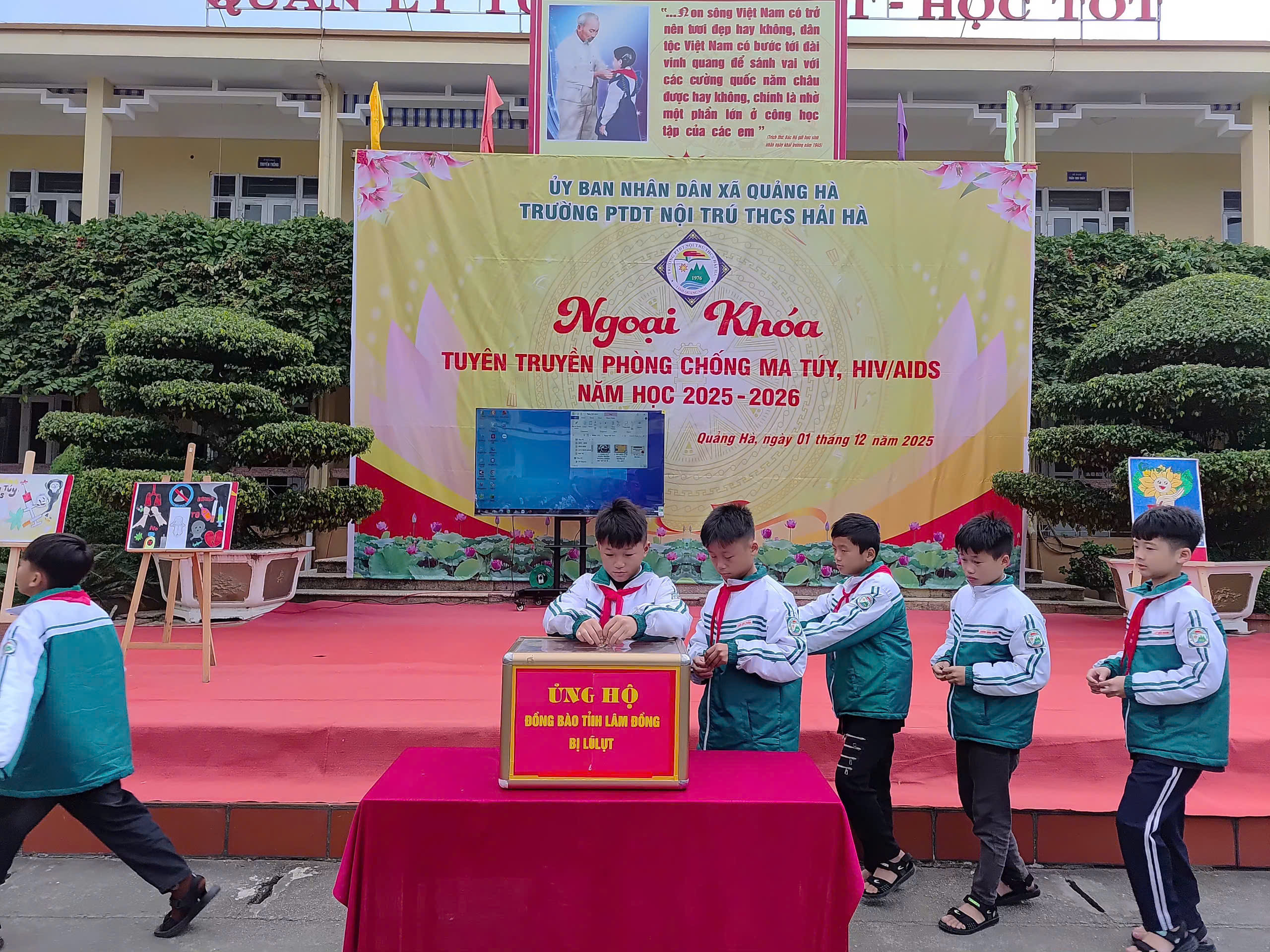 Hưởng ứng Tháng hành động quốc gia phòng, chống HIV/AIDS năm 2025 và Ngày Thế giới phòng, chống AIDS 01/12, sáng ngày 01/12/2025, Liên đội Trường PTDTNT THCS Hải Hà đã tổ chức hoạt động ngoại khóa tuyên truyền phòng chống ma túy, HIV/AIDS với sự tham gia đầy đủ của cán bộ, giáo viên, nhân viên và toàn thể học sinh nhà trường.